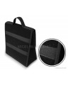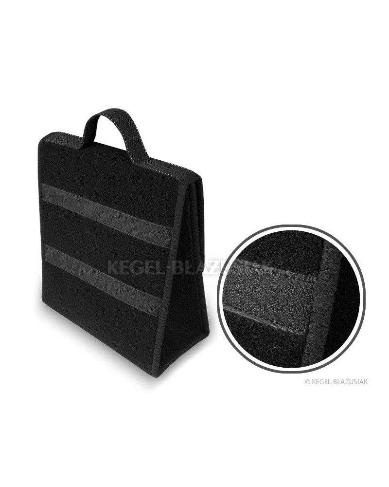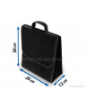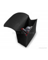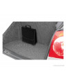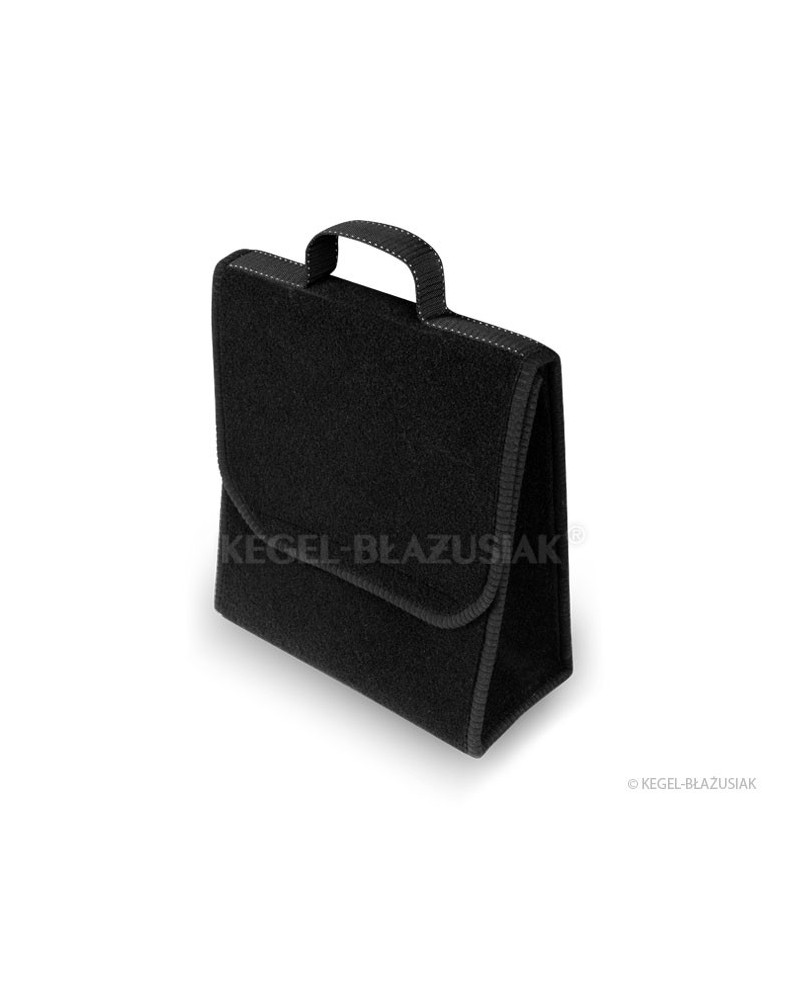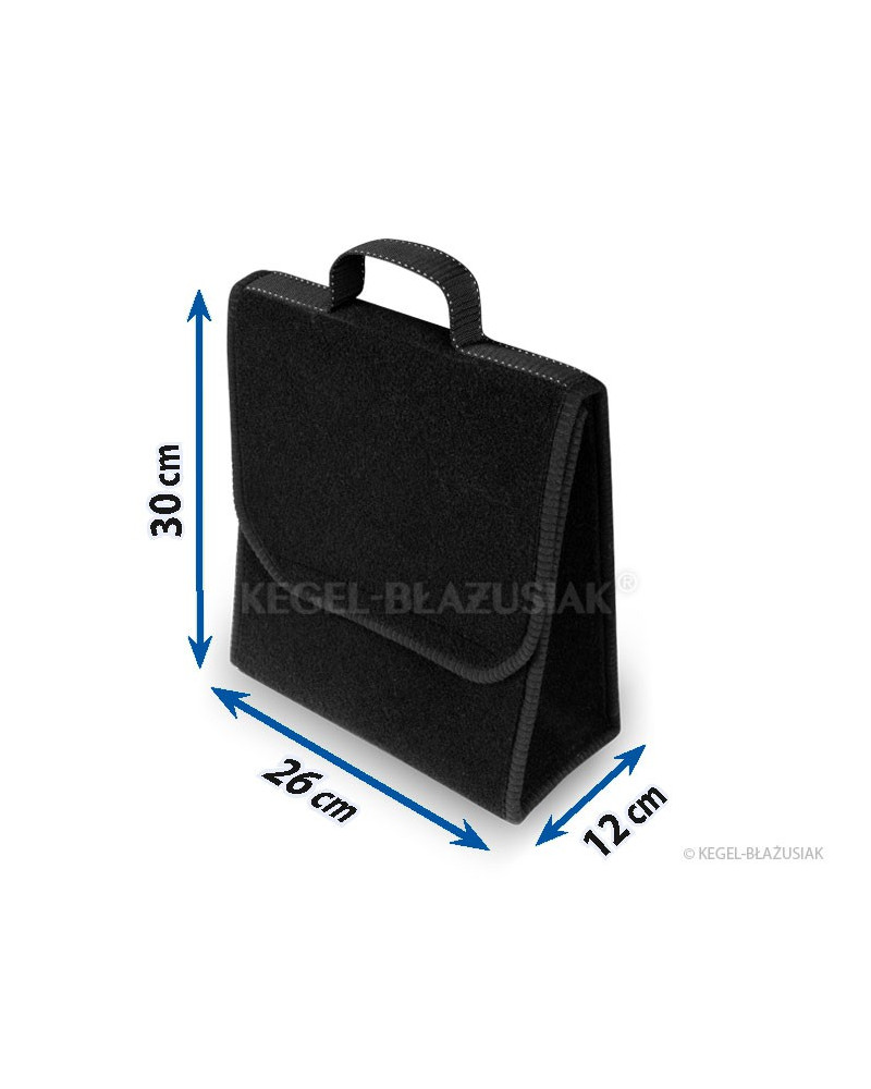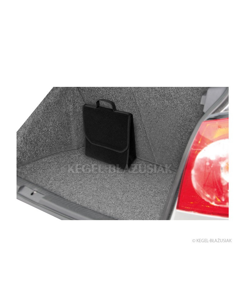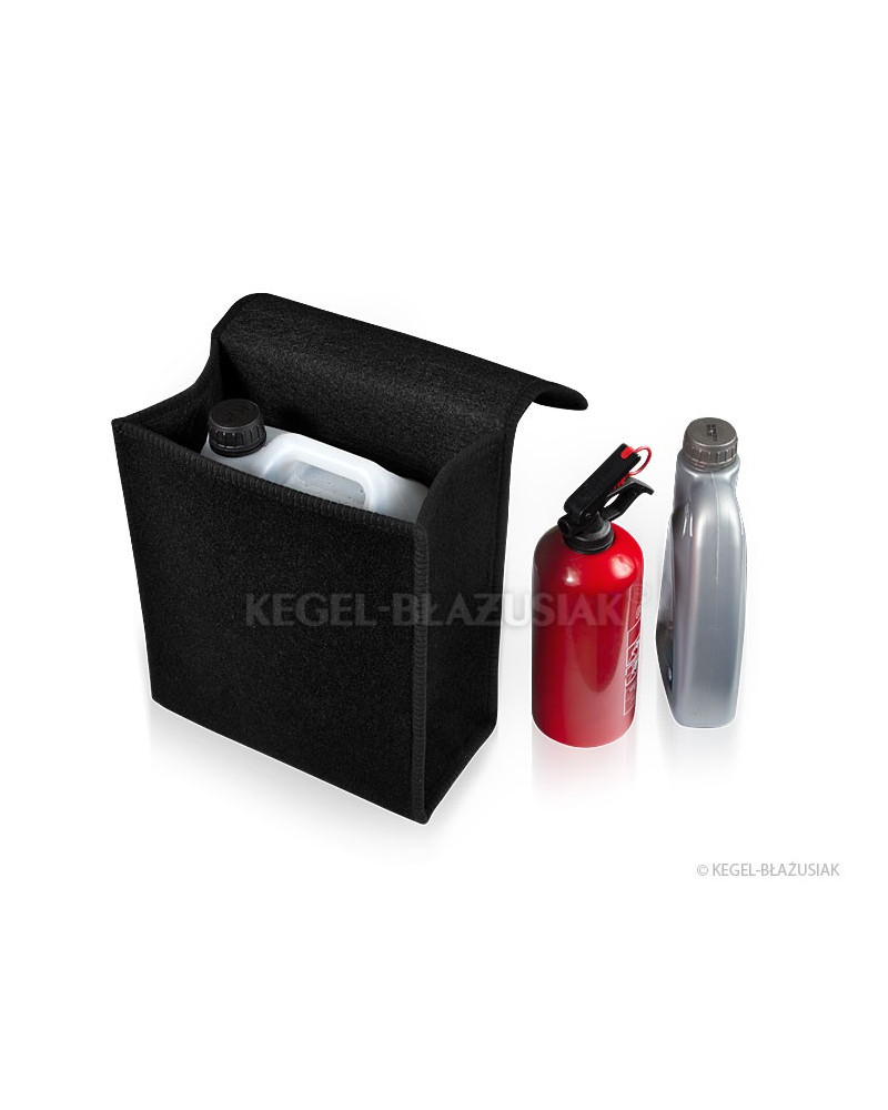 Niezwykle praktyczna torba do bagażnika, wykonana z powtarzalnego materiału dywanowego z mocnymi rzepami od spodu i na tylnej ścianie torby, pozwoli na przechowywanie wielu przedmiotów – nawet tych ciężkich i ostrych. Pomoże utrzymać porządek we wnętrzu samochodu; zabezpieczy przedmioty oraz wnętrze bagażnika przed możliwym uszkodzeniem. Ma poręczny, pionowy kształt umożliwiający przechowanie pięciolitrowego pojemnika z olejem silnikowym lub płynem do spryskiwaczy lub gaśnicy kilowej oraz innych potrzebnych w samochodzie narzędzi, kompletu żarówek, akcesoriów itp. Dzięki mocnym dużym rzepom, biegnącym przez całą długość torby dobrze trzyma się wykładziny bagażnika. Jest bardzo pojemna. Posiada „wieko” zapinane na rzepę z możliwością regulacji. Nie zajmuje dużo miejsca. Dzięki uchwytowi łatwo można ją przenosić. Zrobiona w kolorze czarnym, charakteryzuje się zarówno niezwykłą funkcjonalnością jak i eleganckim wyglądem.