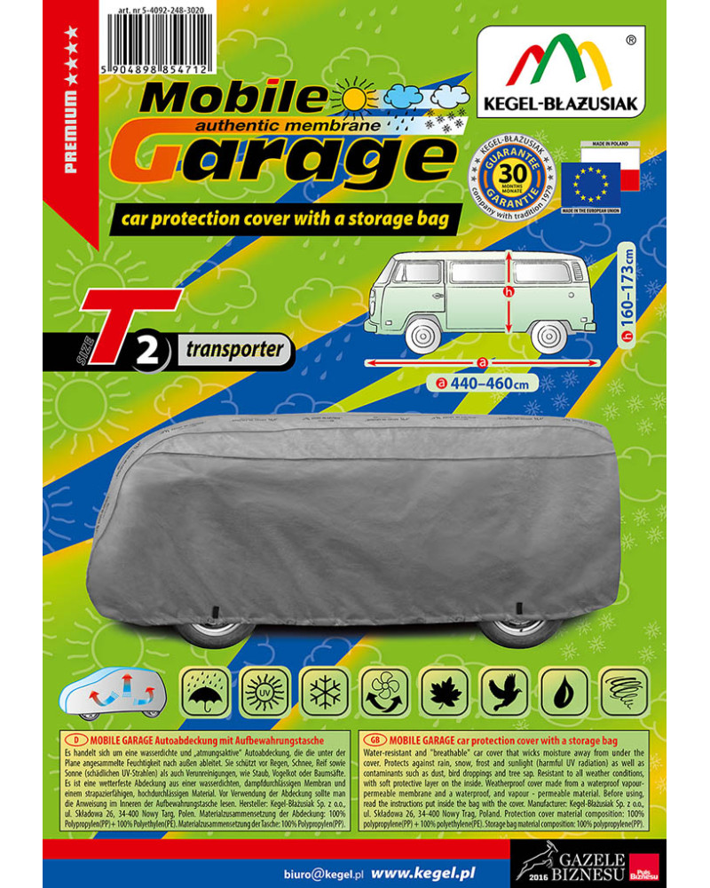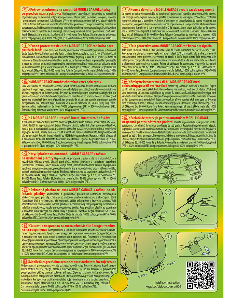 Wysokogatunkowy pokrowiec Mobile Garage to produkt dopasowany do potrzeb kierowców. Pokrowiec wykonany jest z aż 4-warstwowego materiału, który jest gruby, mocny i wytrzymały. Pokrowiec chroni cały samochód przed szkodliwym wpływem środowiska. Pokrowiec Mobile Garage to odpowiednia ochrona pojazdu przez cały rok. Jego funkcjonalność docenić można w każdej porze roku. W sezonie zimowym zapobiega osadzaniu się śniegu, szronu i lodu, a także jest odporny na przymarzanie; na jesieni chroni przed deszczem, wiatrem, liśćmi, sokami z drzew; zaś w porach letnich i wiosennych ochrania przed promieniami UV, pyłem i ptasimi odchodami.