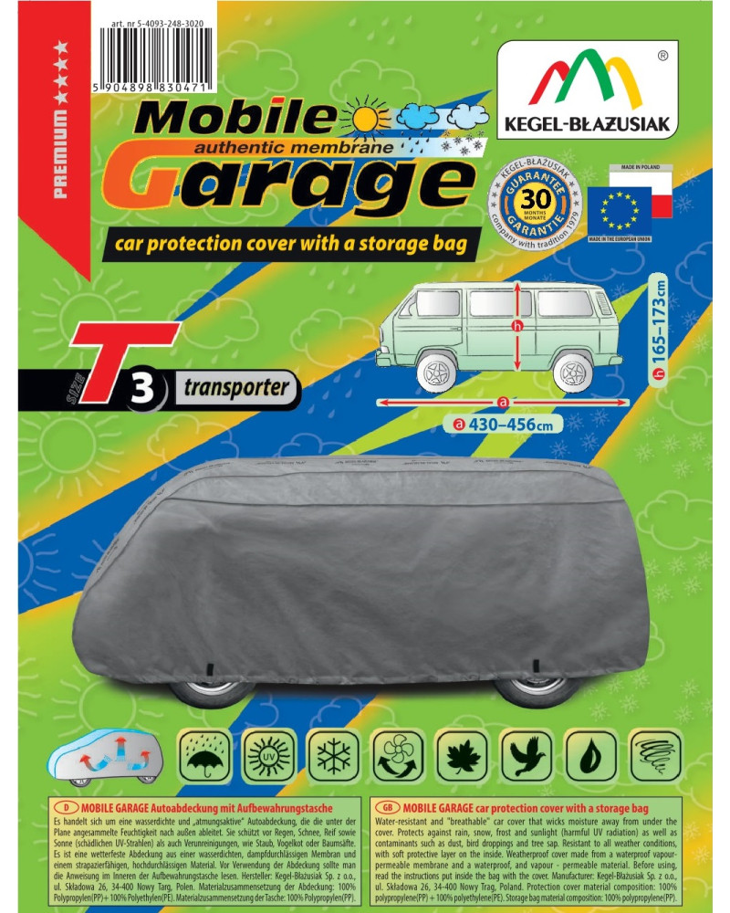 Wysokogatunkowy pokrowiec Mobile Garage to produkt dopasowany do potrzeb kierowców. Pokrowiec wykonany jest z aż 4-warstwowego materiału, który jest gruby, mocny i wytrzymały. Pokrowiec chroni cały samochód przed szkodliwym wpływem środowiska. Pokrowiec Mobile Garage to odpowiednia ochrona pojazdu przez cały rok. Jego funkcjonalność docenić można w każdej porze roku. W sezonie zimowym zapobiega osadzaniu się śniegu, szronu i lodu, a także jest odporny na przymarzanie; na jesieni chroni przed deszczem, wiatrem, liśćmi, sokami z drzew; zaś w porach letnich i wiosennych ochrania przed promieniami UV, pyłem i ptasimi odchodami.