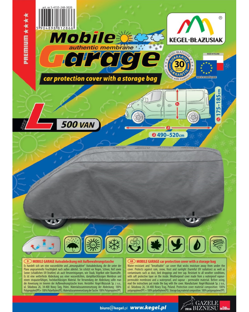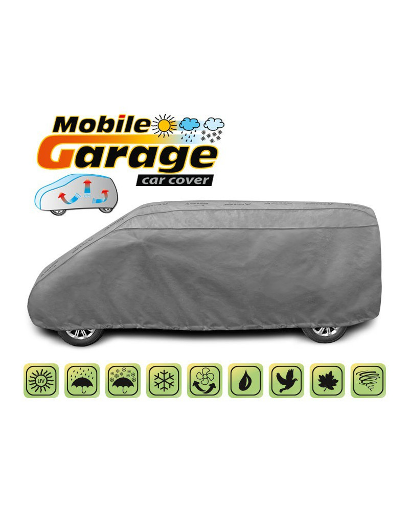 Wysokogatunkowy pokrowiec Mobile Garage to produkt dopasowany do potrzeb kierowców. Pokrowiec wykonany jest z aż 4-warstwowego materiału, który jest gruby, mocny i wytrzymały. Pokrowiec chroni cały samochód przed szkodliwym wpływem środowiska. Pokrowiec Mobile Garage to odpowiednia ochrona pojazdu przez cały rok. Jego funkcjonalność docenić można w każdej porze roku. W sezonie zimowym zapobiega osadzaniu się śniegu, szronu i lodu, a także jest odporny na przymarzanie; na jesieni chroni przed deszczem, wiatrem, liśćmi, sokami z drzew; zaś w porach letnich i wiosennych ochrania przed promieniami UV, pyłem i ptasimi odchodami.