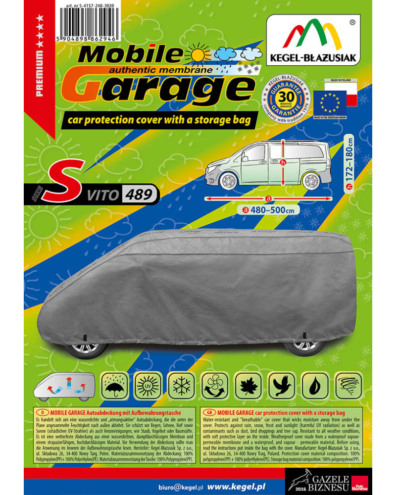 Wysokogatunkowy pokrowiec Mobile Garage to produkt dopasowany do potrzeb kierowców. Pokrowiec wykonany jest z aż 4-warstwowego materiału, który jest gruby, mocny i wytrzymały. Pokrowiec chroni cały samochód przed szkodliwym wpływem środowiska. Pokrowiec Mobile Garage to odpowiednia ochrona pojazdu przez cały rok. Jego funkcjonalność docenić można w każdej porze roku. W sezonie zimowym zapobiega osadzaniu się śniegu, szronu i lodu, a także jest odporny na przymarzanie; na jesieni chroni przed deszczem, wiatrem, liśćmi, sokami z drzew; zaś w porach letnich i wiosennych ochrania przed promieniami UV, pyłem i ptasimi odchodami.