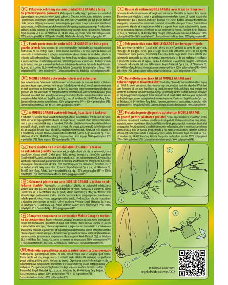 Wysokogatunkowy pokrowiec Mobile Garage to produkt dopasowany do potrzeb kierowców. Pokrowiec wykonany jest z aż 4-warstwowego materiału, który jest gruby, mocny i wytrzymały. Pokrowiec chroni cały samochód przed szkodliwym wpływem środowiska. Pokrowiec Mobile Garage to odpowiednia ochrona pojazdu przez cały rok. Jego funkcjonalność docenić można w każdej porze roku. W sezonie zimowym zapobiega osadzaniu się śniegu, szronu i lodu, a także jest odporny na przymarzanie; na jesieni chroni przed deszczem, wiatrem, liśćmi, sokami z drzew; zaś w porach letnich i wiosennych ochrania przed promieniami UV, pyłem i ptasimi odchodami.
