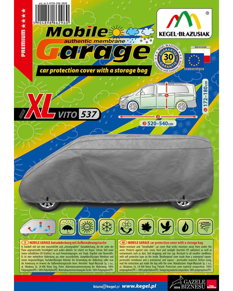 Wysokogatunkowy pokrowiec Mobile Garage to produkt dopasowany do potrzeb kierowców. Pokrowiec wykonany jest z aż 4-warstwowego materiału, który jest gruby, mocny i wytrzymały. Pokrowiec chroni cały samochód przed szkodliwym wpływem środowiska. Pokrowiec Mobile Garage to odpowiednia ochrona pojazdu przez cały rok. Jego funkcjonalność docenić można w każdej porze roku. W sezonie zimowym zapobiega osadzaniu się śniegu, szronu i lodu, a także jest odporny na przymarzanie; na jesieni chroni przed deszczem, wiatrem, liśćmi, sokami z drzew; zaś w porach letnich i wiosennych ochrania przed promieniami UV, pyłem i ptasimi odchodami.