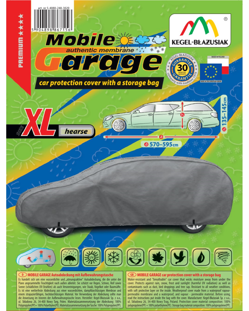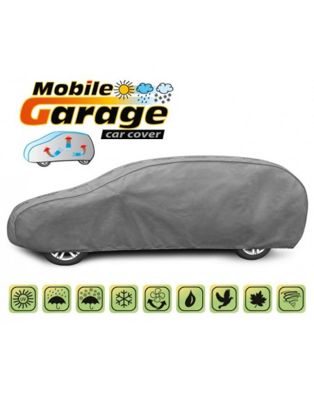 Wysokogatunkowy pokrowiec Mobile Garage to produkt dopasowany do potrzeb kierowców. Pokrowiec wykonany jest z aż 4-warstwowego materiału, który jest gruby, mocny i wytrzymały. Pokrowiec chroni cały samochód przed szkodliwym wpływem środowiska. Pokrowiec Mobile Garage to odpowiednia ochrona pojazdu przez cały rok. Jego funkcjonalność docenić można w każdej porze roku. W sezonie zimowym zapobiega osadzaniu się śniegu, szronu i lodu, a także jest odporny na przymarzanie; na jesieni chroni przed deszczem, wiatrem, liśćmi, sokami z drzew; zaś w porach letnich i wiosennych ochrania przed promieniami UV, pyłem i ptasimi odchodami.