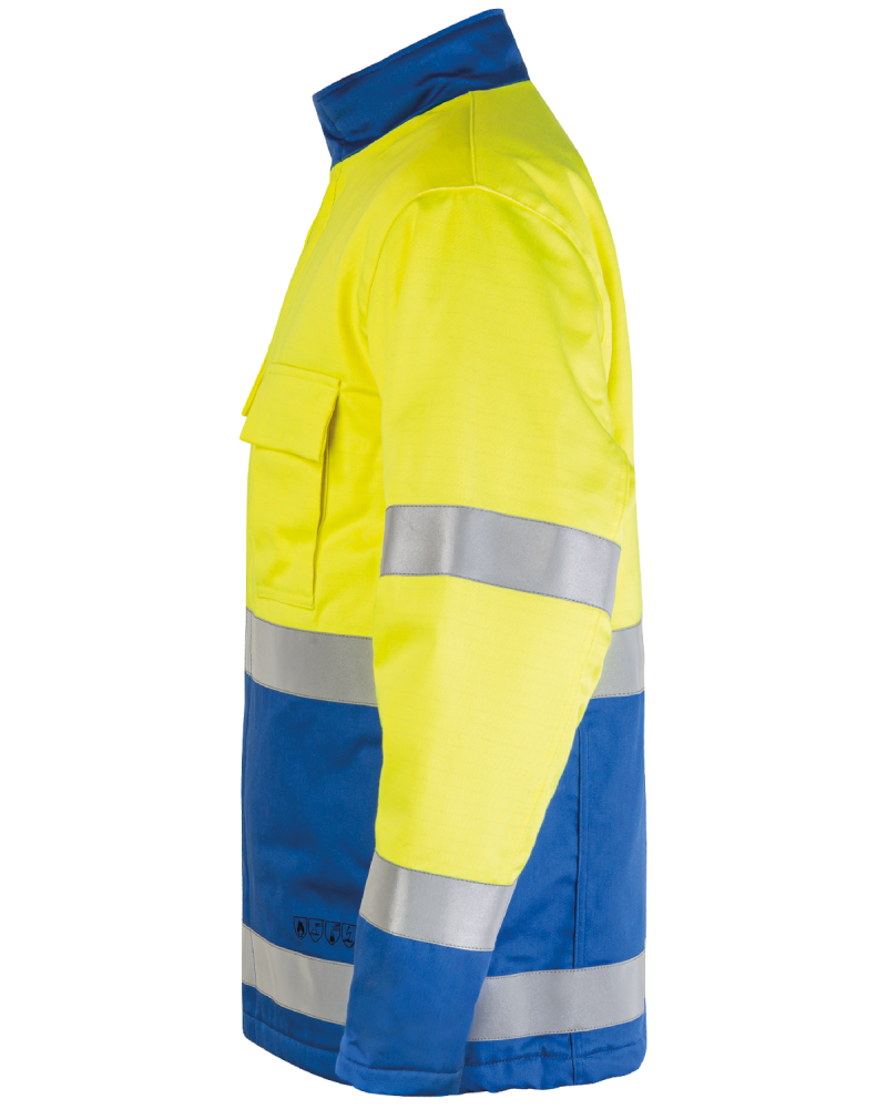 Kurtka ocieplana Hi-vis multiochronna, odblaskowa z firmowej kolekcji Protective gwarantuję bezpieczeństwo i ochronę użytkownika przed wieloma zagrożeniami występującymi jednocześnie w środowisku pracy: zapaleniem w wyniku krótkotrwałego kontaktu z płomieniem oraz oddziaływaniem czynników gorących, przed wyładowaniami iskrowymi mogącymi spowodować zapłon mieszanki wybuchowej oraz przed wyładowaniami elektrostatycznymi, przed przenikaniem ciepła konwekcyjnego, promieniowaniem cieplnym, rozpryskami stopionego żelaza, ciepłem kontaktowym oraz działaniem ciekłych chemikaliów, w przypadku ochlapania.