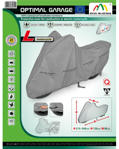 Wysokiej klasy pokrowce na motocykl BASIC GARAGE, dla wielbicieli jednośladów- wodoodporne i paroprzepuszczalne. Wykonane z trzywarstwowej, nieprzemakalnej membrany paroprzepuszczalnej, która zapewnia prawidłową cyrkulację powietrza wewnątrz pokrowców. Materiał zachowuje niemalże całkowitą szczelność, przy jednoczesnym zapewnieniu odpowiedniego przepływu powietrza, umożliwiającego odprowadzanie wilgoci, gromadzącej się pod pokrowcem a w konsekwencji przeciwdziała powstawaniu korozji. Pokrowce ochronią cały motocykl wraz z jego dolną częścią przed szkodliwym wpływem środowiska. Są odporne na działanie promieni UV. Mocowane za pomocą ściągacza z linką wokół całego pojazdu, prawidłowo zawiązane, zapewniają bezpieczeństwo nawet podczas porywistego wiatru. Dzięki szerokiej gamie kształtów i rozmiarów, pokrowce są dobrze dopasowane do różnych motocyklów. Udzielana na 25-miesięcy gwarancja da Ci pewność, że kupujesz produkt najwyższej jakości.