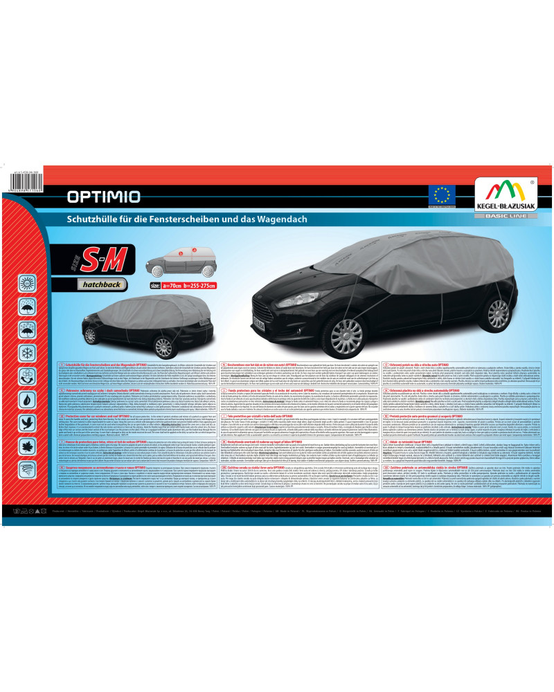 Półplandeki ochronne OPTIMIO, ochronią w zimie dach, szyby i lusterka zaparkowanego samochodu przed osadzającym się szronem i śniegiem. Osłonią klamki i zamki samochodu, zapobiegając ich zamarzaniu. Nie przymarzną do samochodu. Ochronią także przed sokami z drzew, ptasimi odchodami i osadzającymi się pyłami, a nawet promieniami UV. Dlatego możemy stosowac je o każdej porze roku.