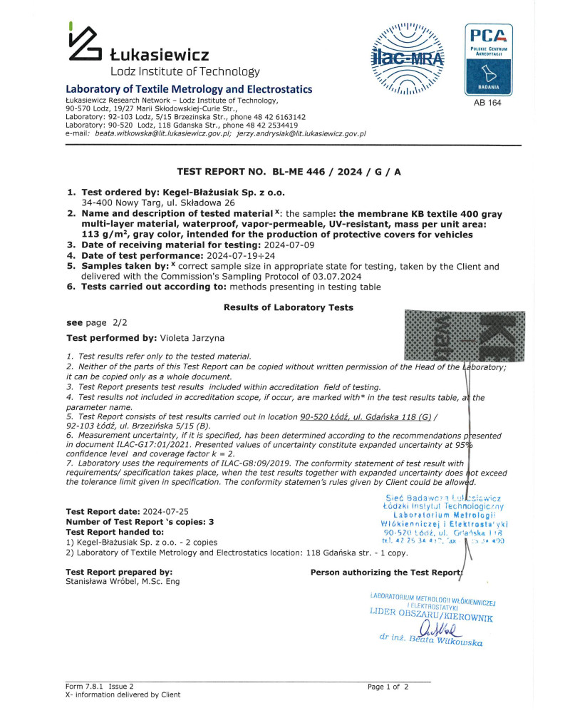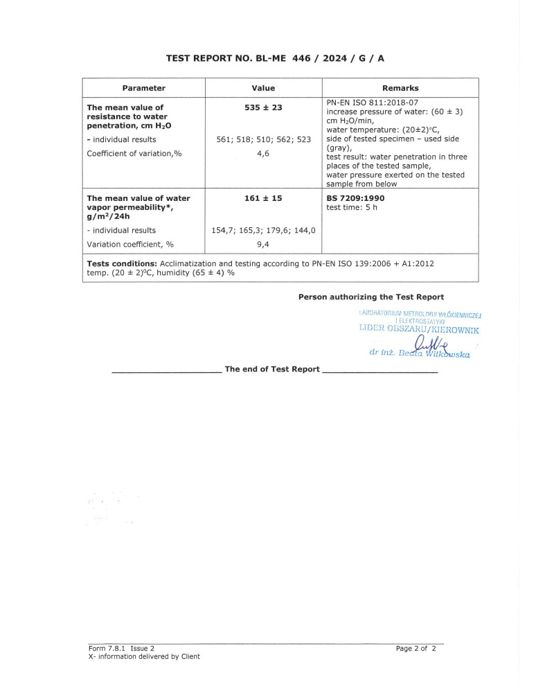 górny pas pokrowca wykonany z czterowarstwowej MEMBRANY