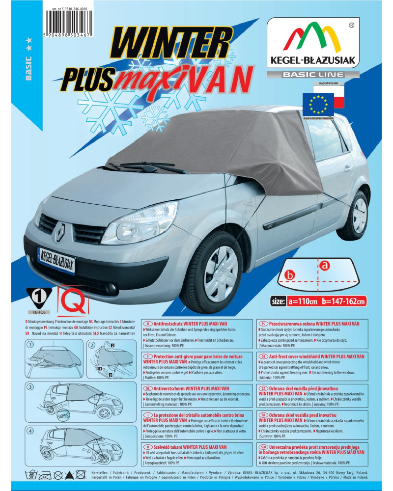 Niezwykle praktyczna osłona, chroniąca przednią szybę, boczne szyby i lusterka zaparkowanego samochodu przed osadzającym się szronem, lodem, śniegiem. Ponadto zapobiega zamrażaniu zamków. Osłona skutecznie zabezpieczy wskazane części samochodu a Tobie zapewni komfort i wygodę. Zaoszczędź dużo czasu, uchroń się od żmudnego zeskrobywania szronu z szyb, zachowaj energię na cały dzień – zastosuj osłonę WINTER PLUS maxi VAN. Osłona zrobiona jest z wysokogatunkowego materiału SPUNBOND prosto z Niemiec- bardzo mocnego, wytrzymałego a przede wszystkim odpornego na przymarzanie. Bardzo łatwo zakłada się ją i ściąga, bardzo prosto czyści. Dla Twojego samochodu i dla Ciebie!