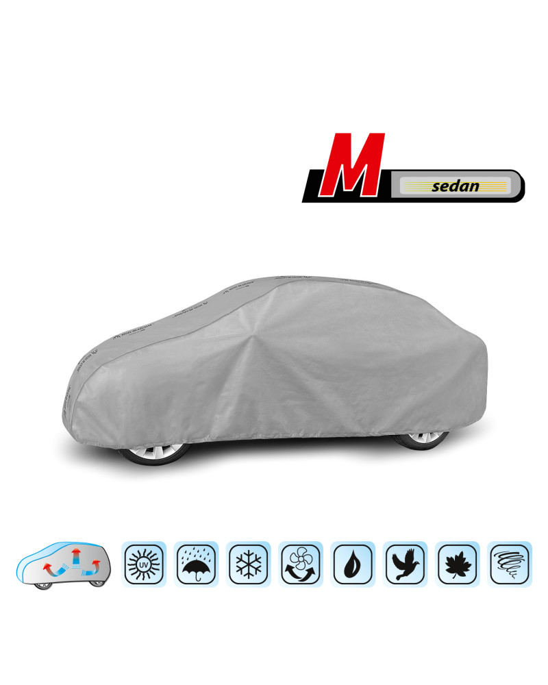 Góra pokrowca jest wodoodporna i nieprzemakalna. Gładki SPUNBOND od wewnątrz, nie rysuje pojazdu.