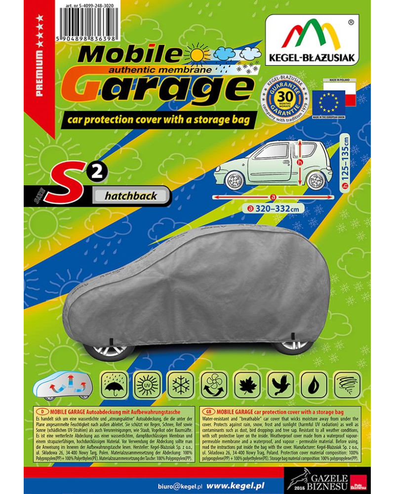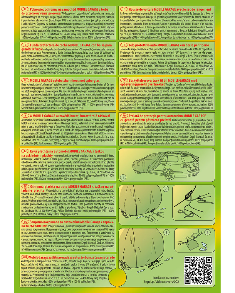 Wysokogatunkowy pokrowiec Mobile Garage to produkt dopasowany do potrzeb kierowców. Pokrowiec wykonany jest z aż 4-warstwowego materiału, który jest gruby, mocny i wytrzymały. Pokrowiec chroni cały samochód przed szkodliwym wpływem środowiska. Pokrowiec Mobile Garage to odpowiednia ochrona pojazdu przez cały rok. Jego funkcjonalność docenić można w każdej porze roku. W sezonie zimowym zapobiega osadzaniu się śniegu, szronu i lodu, a także jest odporny na przymarzanie; na jesieni chroni przed deszczem, wiatrem, liśćmi, sokami z drzew; zaś w porach letnich i wiosennych ochrania przed promieniami UV, pyłem i ptasimi odchodami.