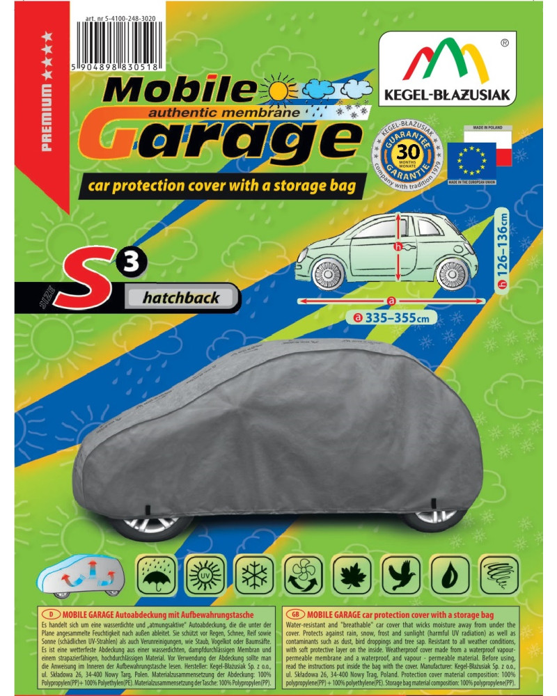 Wysokogatunkowy pokrowiec Mobile Garage to produkt dopasowany do potrzeb kierowców. Pokrowiec wykonany jest z aż 4-warstwowego materiału, który jest gruby, mocny i wytrzymały. Pokrowiec chroni cały samochód przed szkodliwym wpływem środowiska. Pokrowiec Mobile Garage to odpowiednia ochrona pojazdu przez cały rok. Jego funkcjonalność docenić można w każdej porze roku. W sezonie zimowym zapobiega osadzaniu się śniegu, szronu i lodu, a także jest odporny na przymarzanie; na jesieni chroni przed deszczem, wiatrem, liśćmi, sokami z drzew; zaś w porach letnich i wiosennych ochrania przed promieniami UV, pyłem i ptasimi odchodami.