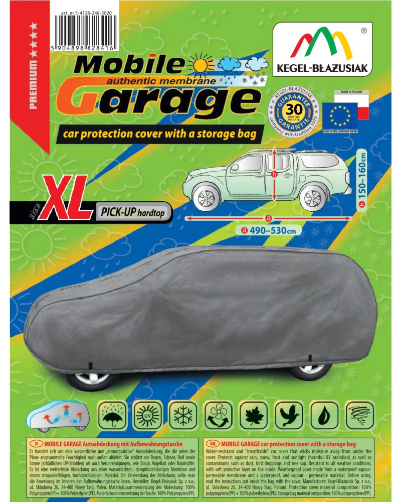 Wysokogatunkowy pokrowiec Mobile Garage to produkt dopasowany do potrzeb kierowców. Pokrowiec wykonany jest z aż 4-warstwowego materiału, który jest gruby, mocny i wytrzymały. Pokrowiec chroni cały samochód przed szkodliwym wpływem środowiska. Pokrowiec Mobile Garage to odpowiednia ochrona pojazdu przez cały rok. Jego funkcjonalność docenić można w każdej porze roku. W sezonie zimowym zapobiega osadzaniu się śniegu, szronu i lodu, a także jest odporny na przymarzanie; na jesieni chroni przed deszczem, wiatrem, liśćmi, sokami z drzew; zaś w porach letnich i wiosennych ochrania przed promieniami UV, pyłem i ptasimi odchodami.