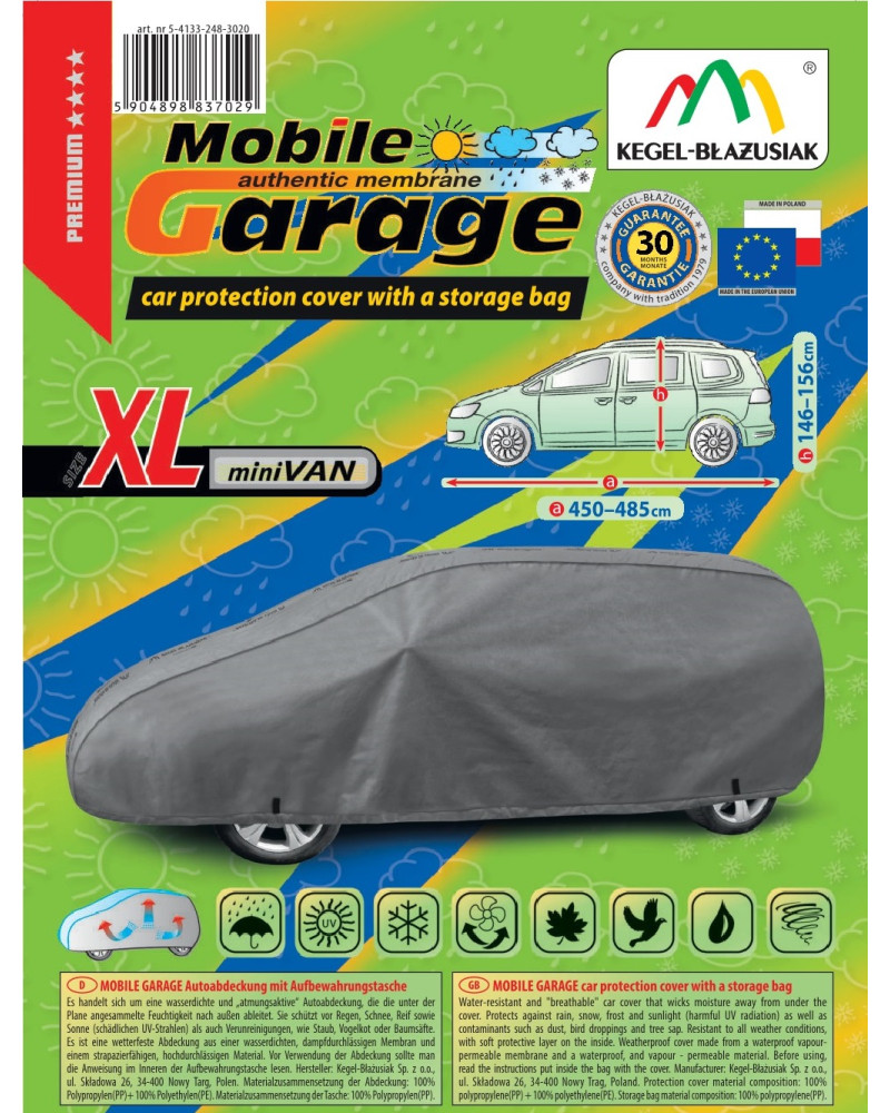 Wysokogatunkowy pokrowiec Mobile Garage to produkt dopasowany do potrzeb kierowców. Pokrowiec wykonany jest z aż 4-warstwowego materiału, który jest gruby, mocny i wytrzymały. Pokrowiec chroni cały samochód przed szkodliwym wpływem środowiska. Pokrowiec Mobile Garage to odpowiednia ochrona pojazdu przez cały rok. Jego funkcjonalność docenić można w każdej porze roku. W sezonie zimowym zapobiega osadzaniu się śniegu, szronu i lodu, a także jest odporny na przymarzanie; na jesieni chroni przed deszczem, wiatrem, liśćmi, sokami z drzew; zaś w porach letnich i wiosennych ochrania przed promieniami UV, pyłem i ptasimi odchodami.