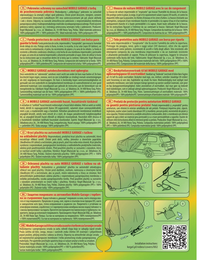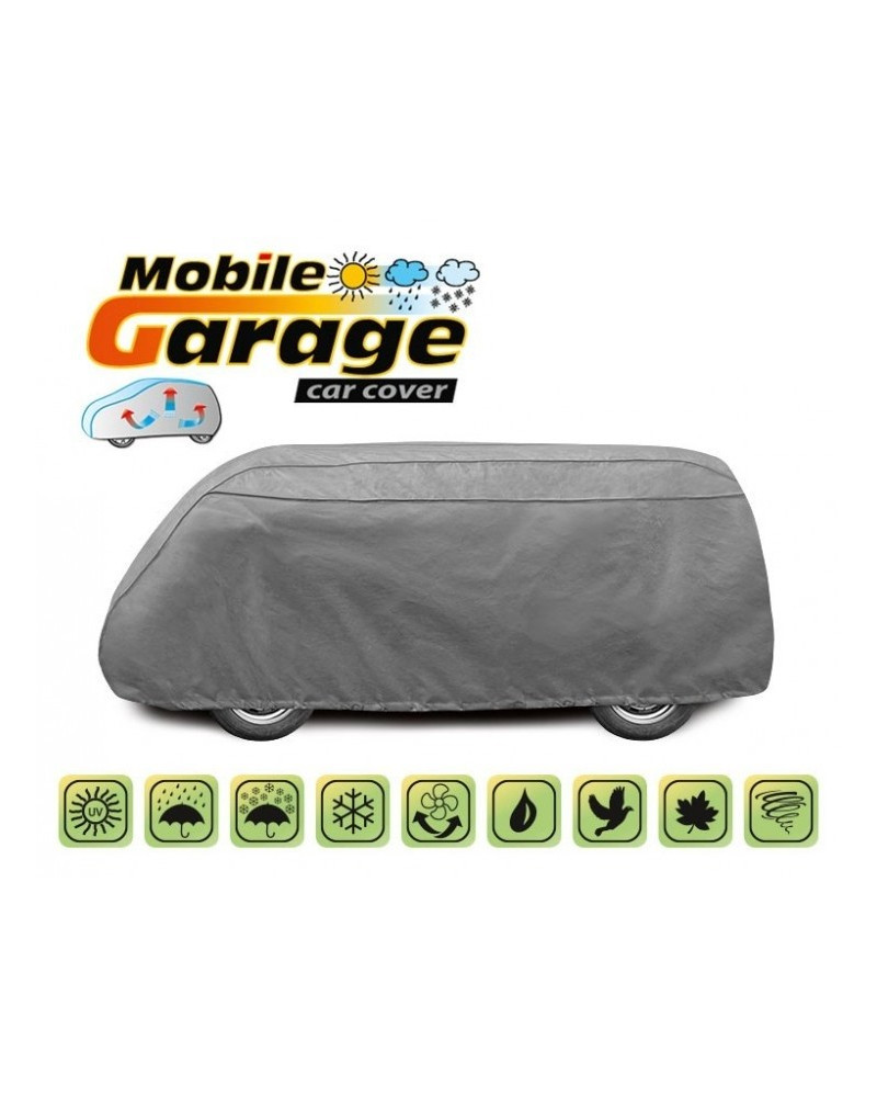 Wysokogatunkowy pokrowiec Mobile Garage to produkt dopasowany do potrzeb kierowców. Pokrowiec wykonany jest z aż 4-warstwowego materiału, który jest gruby, mocny i wytrzymały. Pokrowiec chroni cały samochód przed szkodliwym wpływem środowiska. Pokrowiec Mobile Garage to odpowiednia ochrona pojazdu przez cały rok. Jego funkcjonalność docenić można w każdej porze roku. W sezonie zimowym zapobiega osadzaniu się śniegu, szronu i lodu, a także jest odporny na przymarzanie; na jesieni chroni przed deszczem, wiatrem, liśćmi, sokami z drzew; zaś w porach letnich i wiosennych ochrania przed promieniami UV, pyłem i ptasimi odchodami.