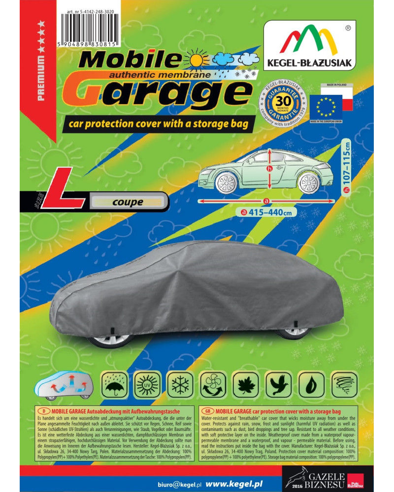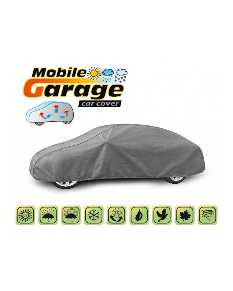 Wysokogatunkowy pokrowiec Mobile Garage to produkt dopasowany do potrzeb kierowców. Pokrowiec wykonany jest z aż 4-warstwowego materiału, który jest gruby, mocny i wytrzymały. Pokrowiec chroni cały samochód przed szkodliwym wpływem środowiska. Pokrowiec Mobile Garage to odpowiednia ochrona pojazdu przez cały rok. Jego funkcjonalność docenić można w każdej porze roku. W sezonie zimowym zapobiega osadzaniu się śniegu, szronu i lodu, a także jest odporny na przymarzanie; na jesieni chroni przed deszczem, wiatrem, liśćmi, sokami z drzew; zaś w porach letnich i wiosennych ochrania przed promieniami UV, pyłem i ptasimi odchodami.