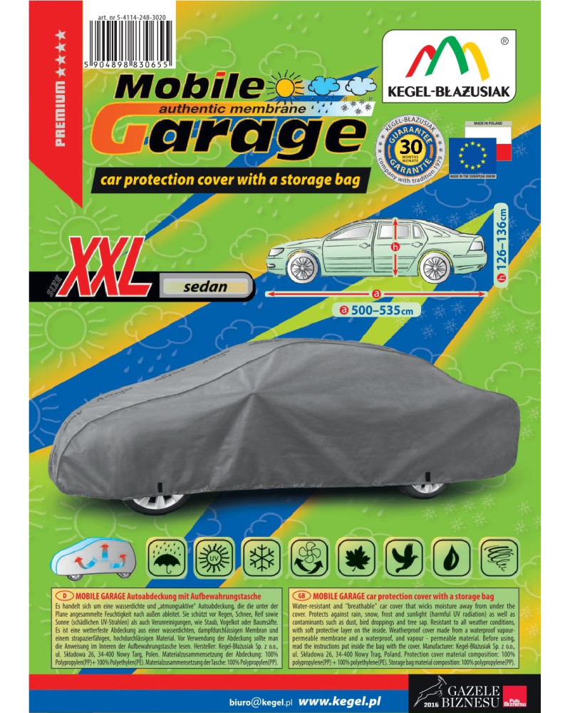 Wysokogatunkowy pokrowiec Mobile Garage to produkt dopasowany do potrzeb kierowców. Pokrowiec wykonany jest z aż 4-warstwowego materiału, który jest gruby, mocny i wytrzymały. Pokrowiec chroni cały samochód przed szkodliwym wpływem środowiska. Pokrowiec Mobile Garage to odpowiednia ochrona pojazdu przez cały rok. Jego funkcjonalność docenić można w każdej porze roku. W sezonie zimowym zapobiega osadzaniu się śniegu, szronu i lodu, a także jest odporny na przymarzanie; na jesieni chroni przed deszczem, wiatrem, liśćmi, sokami z drzew; zaś w porach letnich i wiosennych ochrania przed promieniami UV, pyłem i ptasimi odchodami.