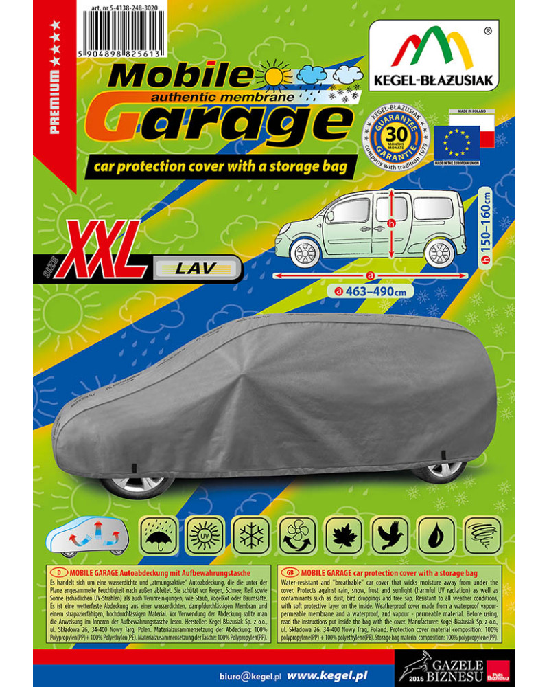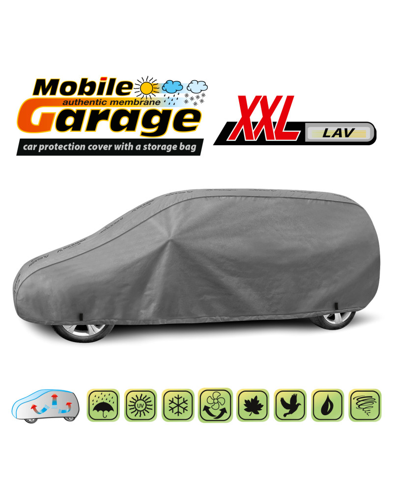 Wysokogatunkowy pokrowiec Mobile Garage to produkt dopasowany do potrzeb kierowców. Pokrowiec wykonany jest z aż 4-warstwowego materiału, który jest gruby, mocny i wytrzymały. Pokrowiec chroni cały samochód przed szkodliwym wpływem środowiska. Pokrowiec Mobile Garage to odpowiednia ochrona pojazdu przez cały rok. Jego funkcjonalność docenić można w każdej porze roku. W sezonie zimowym zapobiega osadzaniu się śniegu, szronu i lodu, a także jest odporny na przymarzanie; na jesieni chroni przed deszczem, wiatrem, liśćmi, sokami z drzew; zaś w porach letnich i wiosennych ochrania przed promieniami UV, pyłem i ptasimi odchodami.