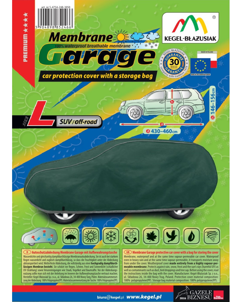 Niezwykłe własciwości wielowarstwowego materiału sprawiają, że pokrowiec nie przemaka, przy jednoczesnym odprowadzaniu pary wodnej spod pokrowca na zewnątrz. Każda oznaka wilgoci, która zgromadzi się pod pokrowcem szybko wyparuje, co pozwoli uniknąć rdzewieniu samochodu oraz powstawaniu pleśni. Pokrowiec przystosowany jest zarówno do doraźnego jak i długotrwałego stosowania. Pokrowiec można prać ręcznie w temperaturze 40 stopni. Pokrowiec ma kolor popielaty, który jest niezwykle praktyczny a zarazem świetnie się prezentuje. Przez środek pokrowca biegnie napis przedstawiający nazwę producenta i logo firmy oraz nazwę materiału z którego został zrobiony- da Ci to gwarancję oryginalności i wysokiej jakości produktu. Różnorodność kształtów i rozmiarów sprawia, że możesz wybrać pokrowiec, który dobrze dopasuje się do Twojego samochodu.