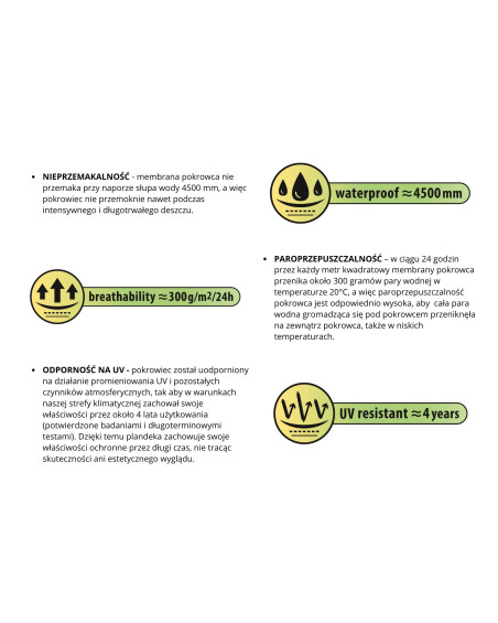 nieprzemakalny nawet podczas intensywnego deszczu i jednocześnie paroprzepuszczalny, odprowadzający na zewnątrz wilgoć spod pokrowca