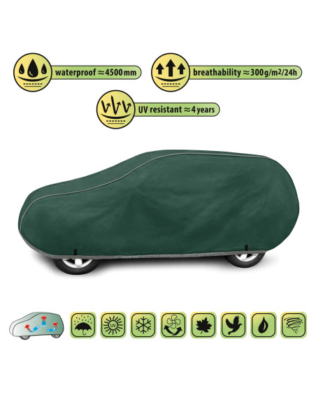 Wysokogatunkowy pokrowiec Mobile Garage to produkt dopasowany do potrzeb kierowców. Pokrowiec wykonany jest z aż 4-warstwowego materiału, który jest gruby, mocny i wytrzymały. Pokrowiec chroni cały samochód przed szkodliwym wpływem środowiska. Pokrowiec Mobile Garage to odpowiednia ochrona pojazdu przez cały rok. Jego funkcjonalność docenić można w każdej porze roku. W sezonie zimowym zapobiega osadzaniu się śniegu, szronu i lodu, a także jest odporny na przymarzanie; na jesieni chroni przed deszczem, wiatrem, liśćmi, sokami z drzew; zaś w porach letnich i wiosennych ochrania przed promieniami UV, pyłem i ptasimi odchodami.