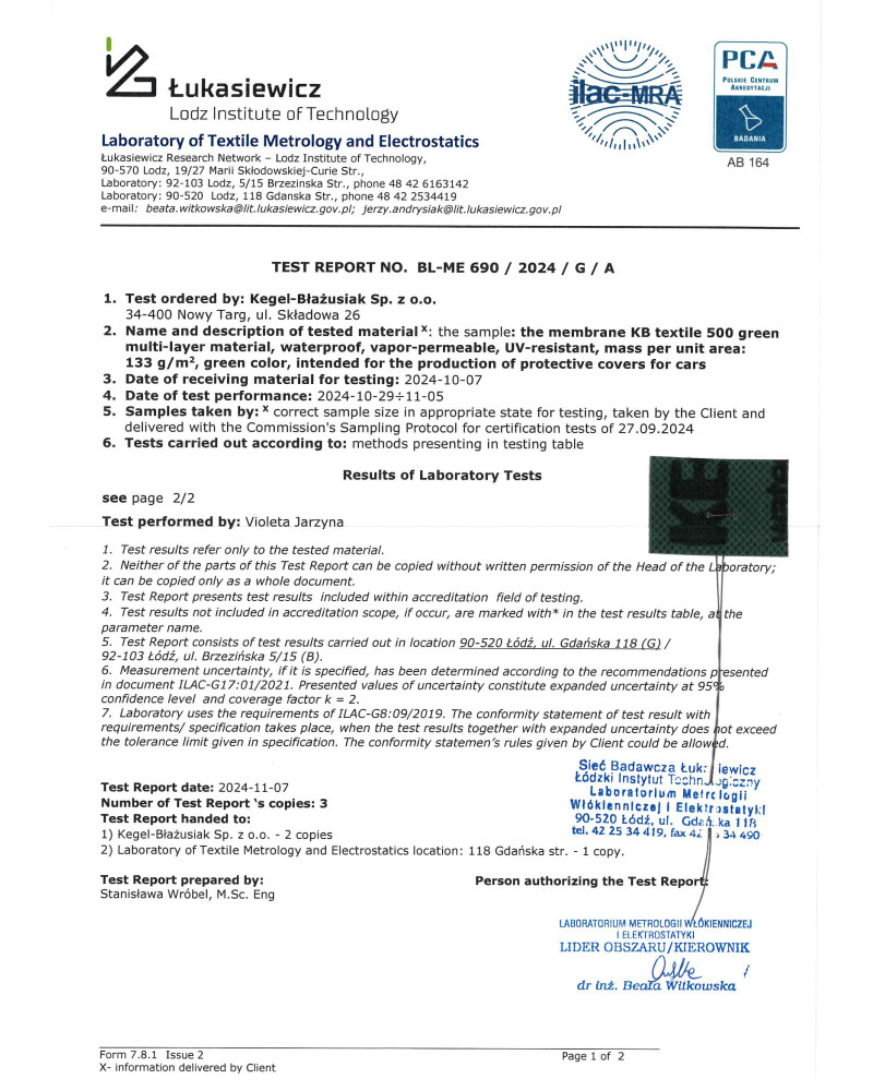 Dobre pokrowce-plandeki nie tylko powinny chronić samochód przez opadami atmosferycznymi, zanieczyszczeniami i promieniami słonecznymi, ale także powinny być bezpieczne. Takie właśnie są nasze pokrowce-plandeki Kegel-Błażusiak. Nasi specjaliści przeprowadzają długotrwałe testy naszych pokrowców-plandek. Testowana jest skuteczność ochrony pojazdu przez pokrowiec-plandekę przed warunkami atmosferycznymi oraz wodoodporność, odprowadzanie pary wodnej z pod pokrowca, bezpieczeństwo pokrowca dla powłoki lakierniczej pojazdu oraz skuteczność mocowania pokrowca na pojeździe w normalnych i ekstremalnych warunkach pogodowych. Tylko produkty, których długotrwałe testy zakończyły się pozytywnie są produkowane przez naszą firmę Kegel-Błażusiak.