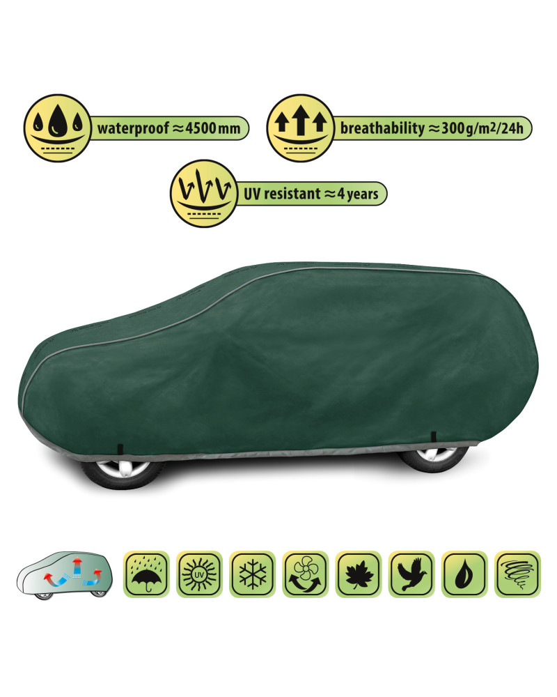 Niezwykłe własciwości wielowarstwowego materiału sprawiają, że pokrowiec nie przemaka, przy jednoczesnym odprowadzaniu pary wodnej spod pokrowca na zewnątrz.  Każda oznaka wilgoci, która zgromadzi się pod pokrowcem szybko wyparuje, co pozwoli uniknąć rdzewieniu samochodu oraz powstawaniu pleśni. Pokrowiec przystosowany jest zarówno do doraźnego jak i długotrwałego stosowania. Pokrowiec można prać ręcznie w temperaturze 40 stopni. Pokrowiec ma kolor popielaty, który jest niezwykle praktyczny a zarazem świetnie się prezentuje. Przez środek pokrowca biegnie napis przedstawiający nazwę producenta i logo firmy oraz nazwę materiału z którego został zrobiony- da Ci to gwarancję oryginalności i wysokiej jakości produktu. Różnorodność kształtów i rozmiarów sprawia, że możesz wybrać pokrowiec, który dobrze dopasuje się do Twojego samochodu.