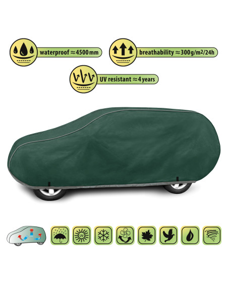 Wysokogatunkowy pokrowiec Mobile Garage to produkt dopasowany do potrzeb kierowców. Pokrowiec wykonany jest z aż 4-warstwowego materiału, który jest gruby, mocny i wytrzymały. Pokrowiec chroni cały samochód przed szkodliwym wpływem środowiska. Pokrowiec Mobile Garage to odpowiednia ochrona pojazdu przez cały rok. Jego funkcjonalność docenić można w każdej porze roku. W sezonie zimowym zapobiega osadzaniu się śniegu, szronu i lodu, a także jest odporny na przymarzanie; na jesieni chroni przed deszczem, wiatrem, liśćmi, sokami z drzew; zaś w porach letnich i wiosennych ochrania przed promieniami UV, pyłem i ptasimi odchodami.