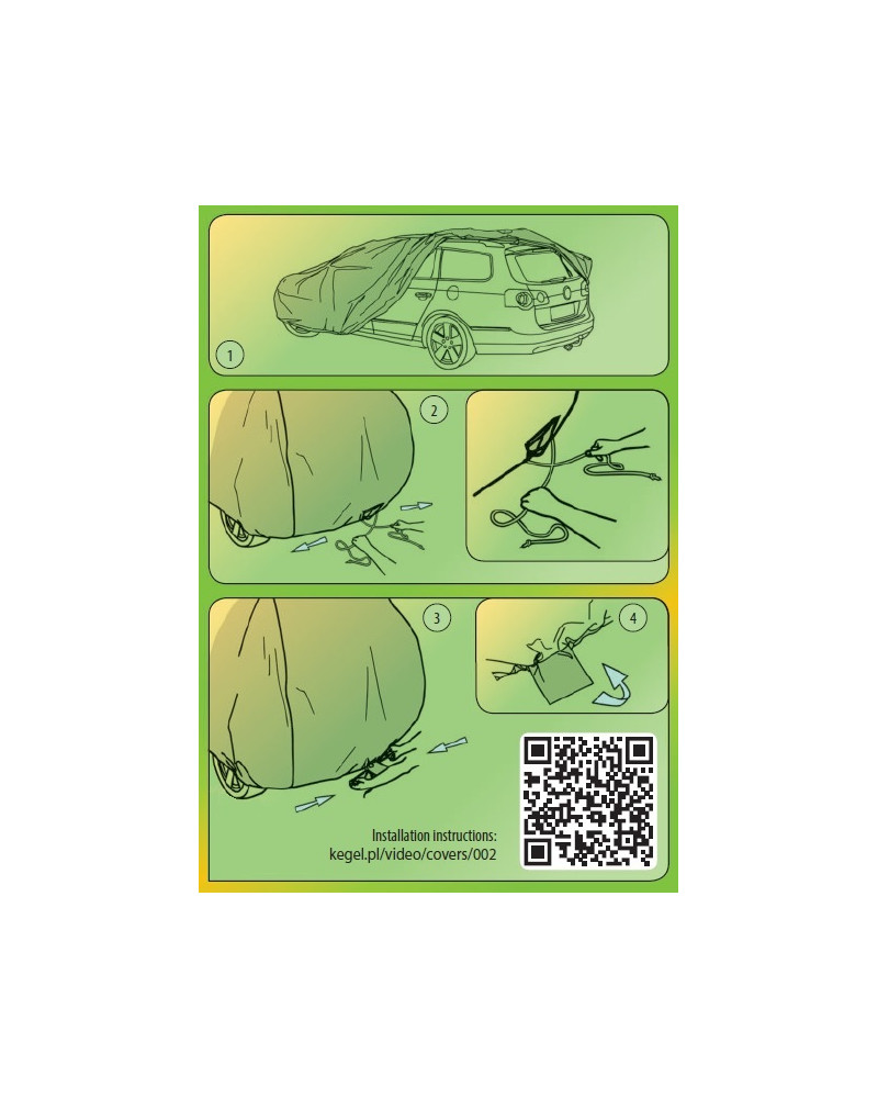 1.Pokrowiec założyć na czysty samochód stroną pokrowca z nadrukiem na zewnątrz.