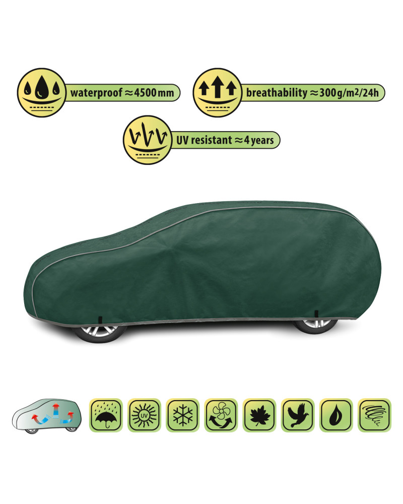 Wysokogatunkowy pokrowiec Mobile Garage to produkt dopasowany do potrzeb kierowców. Pokrowiec wykonany jest z aż 4-warstwowego materiału, który jest gruby, mocny i wytrzymały. Pokrowiec chroni cały samochód przed szkodliwym wpływem środowiska. Pokrowiec Mobile Garage to odpowiednia ochrona pojazdu przez cały rok. Jego funkcjonalność docenić można w każdej porze roku. W sezonie zimowym zapobiega osadzaniu się śniegu, szronu i lodu, a także jest odporny na przymarzanie; na jesieni chroni przed deszczem, wiatrem, liśćmi, sokami z drzew; zaś w porach letnich i wiosennych ochrania przed promieniami UV, pyłem i ptasimi odchodami.