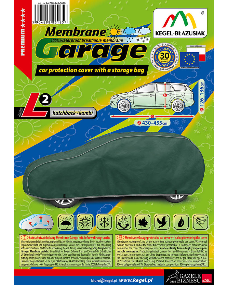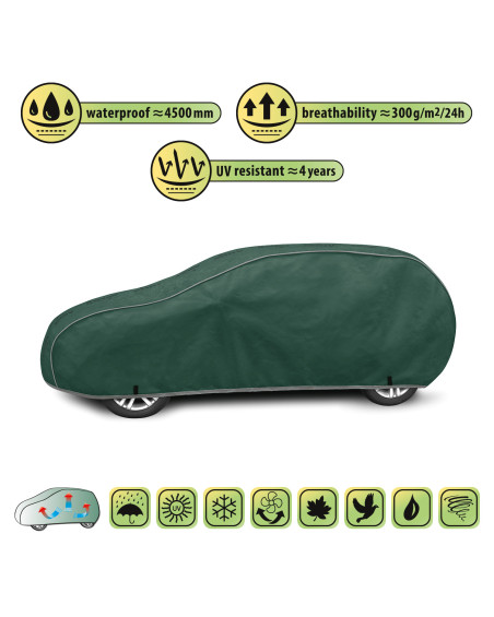 Wysokogatunkowy pokrowiec Mobile Garage to produkt dopasowany do potrzeb kierowców. Pokrowiec wykonany jest z aż 4-warstwowego materiału, który jest gruby, mocny i wytrzymały. Pokrowiec chroni cały samochód przed szkodliwym wpływem środowiska. Pokrowiec Mobile Garage to odpowiednia ochrona pojazdu przez cały rok. Jego funkcjonalność docenić można w każdej porze roku. W sezonie zimowym zapobiega osadzaniu się śniegu, szronu i lodu, a także jest odporny na przymarzanie; na jesieni chroni przed deszczem, wiatrem, liśćmi, sokami z drzew; zaś w porach letnich i wiosennych ochrania przed promieniami UV, pyłem i ptasimi odchodami.