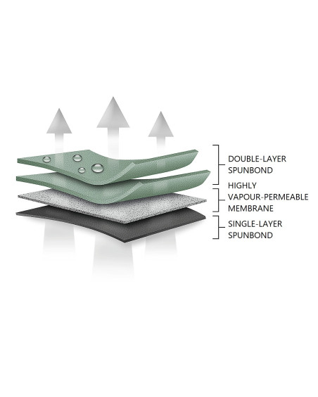 Boki pokrowca, są natomiast 2-warstwowe, wykonane z dwuwarstwowej włókniny SPUNBOND. Boki pokrowca są wysokoparoprzepuszczalne i bardzo trudnoprzemakalne.
