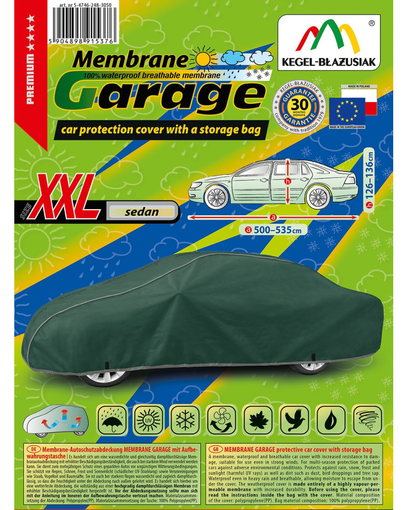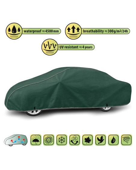 Wysokogatunkowy pokrowiec Mobile Garage to produkt dopasowany do potrzeb kierowców. Pokrowiec wykonany jest z aż 4-warstwowego materiału, który jest gruby, mocny i wytrzymały. Pokrowiec chroni cały samochód przed szkodliwym wpływem środowiska. Pokrowiec Mobile Garage to odpowiednia ochrona pojazdu przez cały rok. Jego funkcjonalność docenić można w każdej porze roku. W sezonie zimowym zapobiega osadzaniu się śniegu, szronu i lodu, a także jest odporny na przymarzanie; na jesieni chroni przed deszczem, wiatrem, liśćmi, sokami z drzew; zaś w porach letnich i wiosennych ochrania przed promieniami UV, pyłem i ptasimi odchodami.