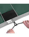 - Pokrowiec w rogach nad ściągaczem mocującym ma wszyte dodatkowe elastyczne pasy mocujące, które podczas zakładania zahaczą się o krawędź zderzaka.