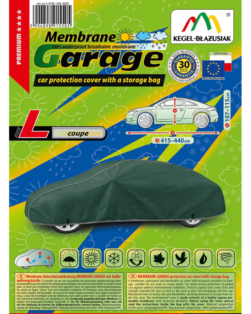 Wysokogatunkowy pokrowiec Mobile Garage to produkt dopasowany do potrzeb kierowców. Pokrowiec wykonany jest z aż 4-warstwowego materiału, który jest gruby, mocny i wytrzymały. Pokrowiec chroni cały samochód przed szkodliwym wpływem środowiska. Pokrowiec Mobile Garage to odpowiednia ochrona pojazdu przez cały rok. Jego funkcjonalność docenić można w każdej porze roku. W sezonie zimowym zapobiega osadzaniu się śniegu, szronu i lodu, a także jest odporny na przymarzanie; na jesieni chroni przed deszczem, wiatrem, liśćmi, sokami z drzew; zaś w porach letnich i wiosennych ochrania przed promieniami UV, pyłem i ptasimi odchodami.