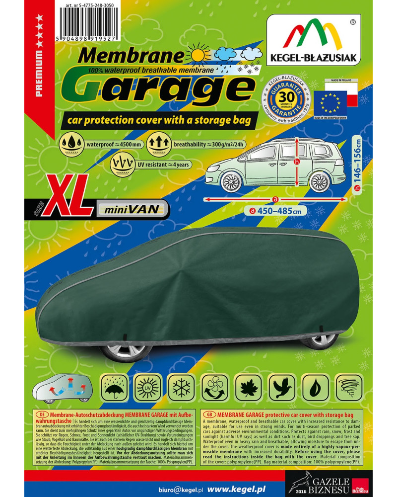 Wysokogatunkowy pokrowiec Mobile Garage to produkt dopasowany do potrzeb kierowców. Pokrowiec wykonany jest z aż 4-warstwowego materiału, który jest gruby, mocny i wytrzymały. Pokrowiec chroni cały samochód przed szkodliwym wpływem środowiska. Pokrowiec Mobile Garage to odpowiednia ochrona pojazdu przez cały rok. Jego funkcjonalność docenić można w każdej porze roku. W sezonie zimowym zapobiega osadzaniu się śniegu, szronu i lodu, a także jest odporny na przymarzanie; na jesieni chroni przed deszczem, wiatrem, liśćmi, sokami z drzew; zaś w porach letnich i wiosennych ochrania przed promieniami UV, pyłem i ptasimi odchodami.