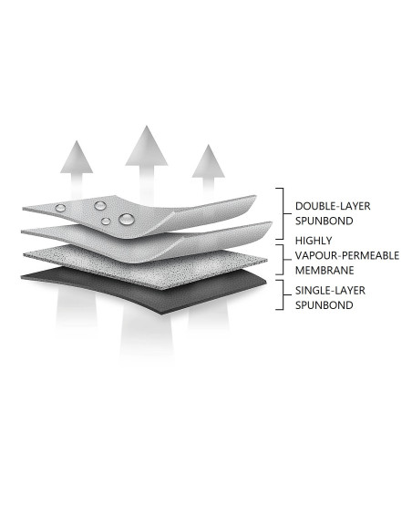 Boki pokrowca, są natomiast 2-warstwowe, wykonane z dwuwarstwowej włókniny SPUNBOND. Boki pokrowca są wysokoparoprzepuszczalne i bardzo trudnoprzemakalne.