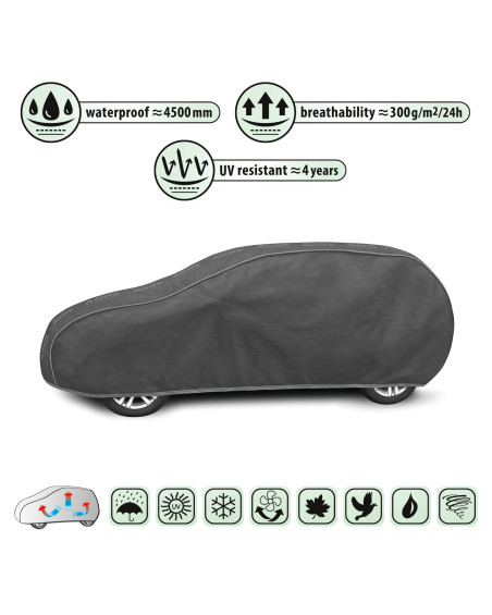 Góra pokrowca jest wodoodporna i nieprzemakalna. Gładki SPUNBOND od wewnątrz, nie rysuje pojazdu.
