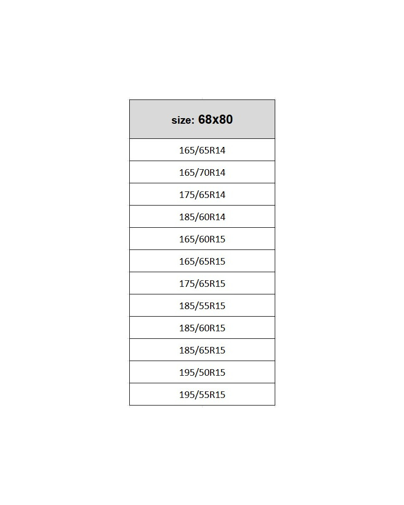 Pasuje na opony o rozmiarze: 175/70-R14, 175/80-R14, 185/60-R14, 185/65-R14, 185/70-R14, 195/60-R14, 195/65-R14, 205/65-R14, 185/55-R15, 185/60-R15, 185/65-R15, 195/50-R15, 195/55-R15, 195/60-R15, 195/65-R15, 195/70-R15, 205/55-R15, 205/65-R15, 195/50-R16, 195/65-R16, 205/55-R16, 225/45-R17