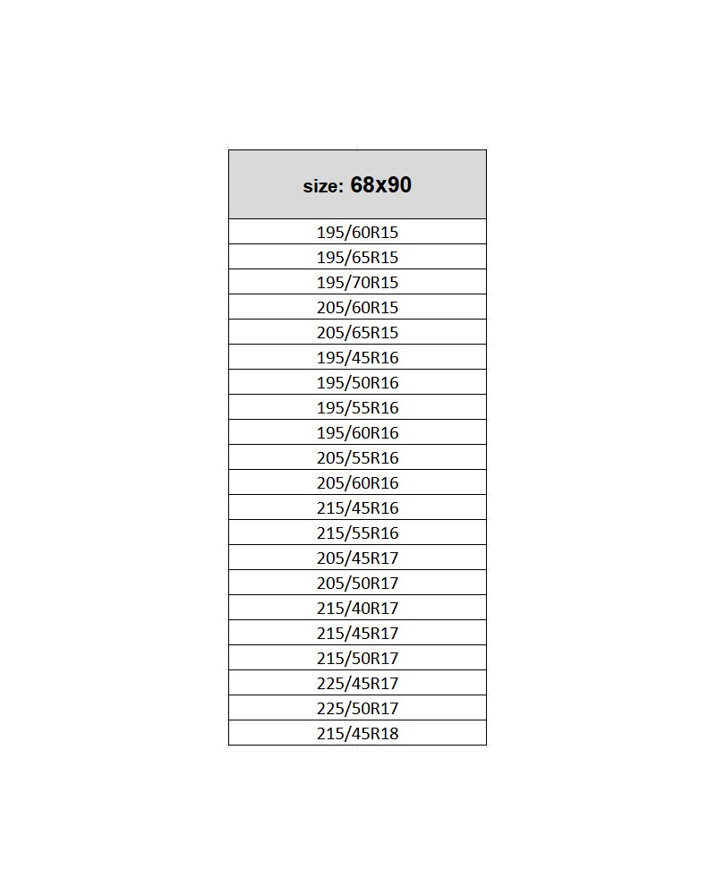 Pasuje na opony o rozmiarze: 175/70-R14, 175/80-R14, 185/60-R14, 185/65-R14, 185/70-R14, 195/60-R14, 195/65-R14, 205/65-R14, 185/55-R15, 185/60-R15, 185/65-R15, 195/50-R15, 195/55-R15, 195/60-R15, 195/65-R15, 195/70-R15, 205/55-R15, 205/65-R15, 195/50-R16, 195/65-R16, 205/55-R16, 225/45-R17