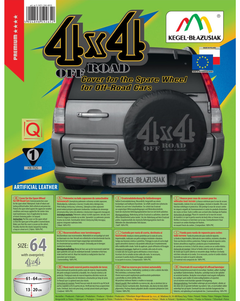 Wysokiej jakości pokrowiec zewnętrzny na koło zapasowe 4x4 – wykonany z wysokiej jakości skóry ekologicznej. Wodoodporny materiał zabezpiecza koło przed deszczem, niekorzystnym wpływem środowiska zewnętrznego a także środkami do zimowego utrzymania dróg. Pełni funkcję ochronną a także estetyczną. Bardzo dobrze prezentuje się i współgra wizualnie z każdym samochodem. Jest w kolorze czarnym z atrakcyjnym nadrukiem 4x4 z przodu pokrowca.