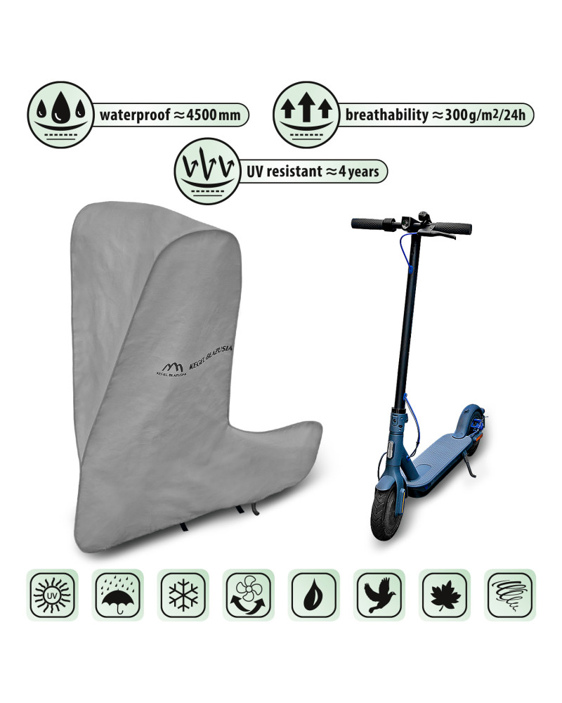 Produkt wielosezonowy, którego funkcjonalność docenić można o każdej porze roku. W sezonie zimowym zapobiega osadzaniu się śniegu, szronu i lodu, a także jest odporny na przymarzanie; na jesieni chroni przed deszczem, wiatrem, liśćmi, sokami z drzew; zaś w porach letnich i wiosennych ochrania przed promieniami UV , pyłem kwiatów i ptasimi odchodami. Pokrowiec ochroni Twój skuter przed wżerami, blaknięciem i matowieniem lakieru oraz elementów chromowanych, zabezpieczy go przed większością zarysowań. Pokrowiec przystosowany jest zarówno do doraźnego jak i długotrwałego stosowania. Stworzony głównie z myślą o osobach, które nie mają możliwości garażowania pojazdu. Wykonany jest z niezwykle trwałego i mocnego materiału wysokiej jakości, który od wewnętrznej strony jest całkowicie gładki, bezpieczny dla pojazdu. Nie powoduje rysowania ani starcia lakieru nawet przy silnych podmuchach wiatru. Zrobiony w popielatym kolorze jest niezwykle praktyczny a zarazem świetnie się prezentuje.