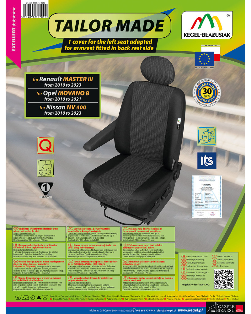 Pokrowce miarowe ARES zostały zaprojektowane z myślą o właścicielach konkretnych samochodów dostawczych i mikrobusów, chcących zadbać o wnętrza swoich pojazdów- dodać im klasy i elegancji oraz ochronić tapicerkę przed wszelkiego rodzaju zabrudzeniami i uszkodzeniami. Dzięki odpowiedniej budowie, materiał dobrze dopasowuje się do siedzenia, a podlaminowanie po wewnętrznej stronie trudno-palną pianką PUR, zapobiega przesuwaniu pokrowca. Pokrowce ARES spełniają najwyższe normy wytrzymałościowe. Solidność wykonania oraz gwarancję bezpieczeństwa potwierdzają badania TÜV Rheinland Polska oraz PIMOT. Przy produkcji pokrowców została zastosowana technologia bezpiecznego szwu, rozrywającego się podczas wybuchu bocznych poduszek powietrznych. Profesjonalne wykonanie z materiałów wysokiej jakości gwarantuje długi czas użytkowania. Oferowane pokrowce z pewnością zaspokoją oczekiwania nawet najbardziej wymagających klientów. Udzielana na 25-miesięcy gwarancja da Ci pewność, że kupujesz produkt najwyższej jakości.