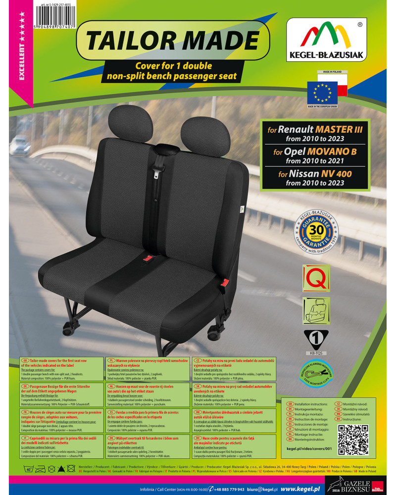 Zaletą pokrowców ARES jest to, że zakrywają całą tylną powierzchnię oparcia. Ma to duże znaczenie, szczególnie dla właścicieli mikrobusów, ponieważ ta właściwość sprawia, że bardzo dobrze prezentują się także z tyłu fotela, jednocześnie chroniąc go przed zabrudzeniami i uszkodzeniami. Pokrowce wyposażone są w niezbędne, zapinane otwory umożliwiające założenie pokrowca bez konieczności wyciągania zagłówków i wykonywania dodatkowych otworów. Przystosowane są do samochodów posiadających pełny pas bezpieczeństwa, wychodzący z podwójnej kanapy pasażerów. Komplet wyposażony jest w specjalne klamerki, a do materiału wszyte są mocowania, co przy pomocy dołączonej obrazkowej instrukcji obsługi zapewnia bardzo łatwy montaż. Pokrowce można bez obaw prać w temperaturze 40° - zgodnie z zaleceniami na metce. Produkt renomowanej firmy Kegel- Błażusiak. Największego producenta i eksportera w branży pokrowców samochodowych i odzieży roboczej. Produkowany w Polsce, głównie z polskich surowców z zachowaniem wszystkich standardów jakościowych Unii Europejskiej. Kupując pokrowce Kegel-Błażusiak wspierasz polską gospodarkę i chronisz polskie miejsca pracy.