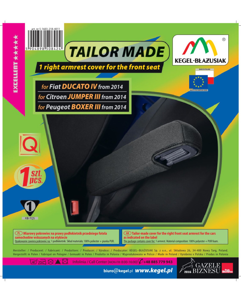 Zaletą pokrowców ARES jest to, że zakrywają całą tylną powierzchnię oparcia. Ma to duże znaczenie, szczególnie dla właścicieli mikrobusów, ponieważ ta właściwość sprawia, że bardzo dobrze prezentują się także z tyłu fotela, jednocześnie chroniąc go przed zabrudzeniami i uszkodzeniami. Komplet wyposażony jest w specjalne klamerki, a do materiału wszyte są mocowania, co przy pomocy dołączonej obrazkowej instrukcji obsługi zapewnia bardzo łatwy montaż. Pokrowce można bez obaw prać w temperaturze 40° - zgodnie z zaleceniami na metce. Produkt renomowanej firmy Kegel-Błażusiak. Największego producenta i eksportera w branży pokrowców samochodowych i odzieży roboczej. Produkowany w Polsce, głównie z polskich surowców z zachowaniem wszystkich standardów jakościowych Unii Europejskiej. Kupując pokrowce Kegel-Błażusiak wspierasz polską gospodarkę i chronisz polskie miejsca pracy.