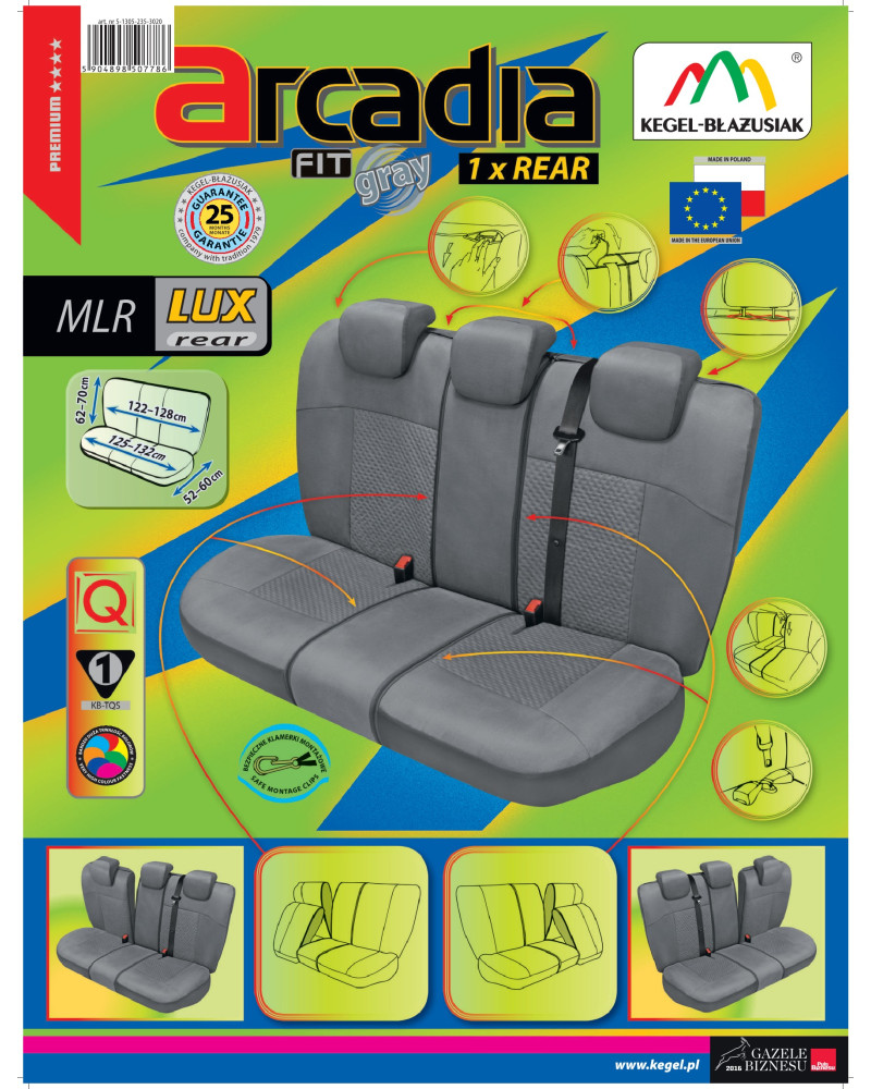 - Łatwy w utrzymaniu- możliwość prania w 40°-Wykonane w wersji LUX/EXTRA z elegancko wykończonymi otworami pod zagłówki i wszystkie pasy bezpieczeństwa (także trzeci, środkowy) oraz gniazda pasów , a także z systemem wykańczającym boki dzielenia tylnej kanapy (Dividable System).