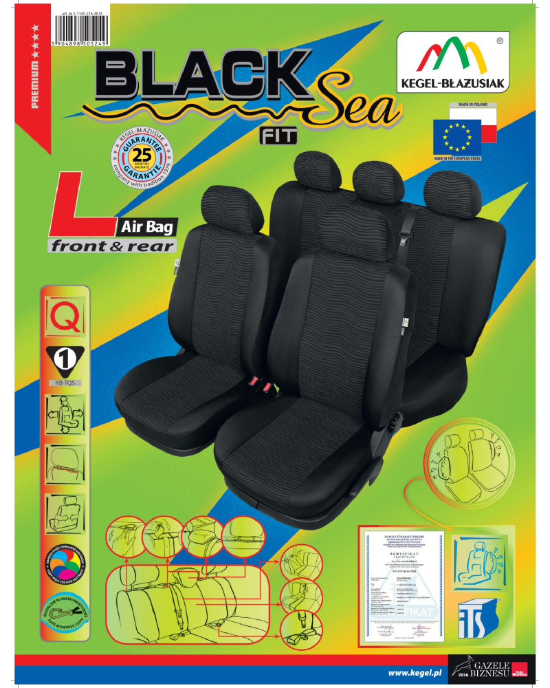 Pokrowce uniwersalne dopasowane BLACK SEA – wysokiej klasy pokrowce samochodowe - odświeżą wnętrze Twojego samochodu, zabezpieczą oryginalne poszycie foteli przed zniszczeniem a ponadto dodadzą pojazdowi szyku i elegancji, gdyż świetnie prezentują się we wnętrzu pojazdu. Pokrowce dobrze pasują na wybraną grupę modeli samochodów. Wyposażone są w specjalne, atestowane szwy dla bocznych poduszek powietrznych, rozrywają się w odpowiednim miejscu podczas ich wybuchu- bezpieczeństwo szwu potwierdzają certyfikat oraz badania przeprowadzone przez Instytut Transportu Samochodowego. Podlaminowanie po wewnętrznej stronie większej części materiału pianką PUR, zapobiega ich przesuwaniu. Wykonanie z mocnego, trwałego, grubego materiału żakardowego, zapewnia możliwość użytkowania przez lata. Udzielana na 25-miesięcy gwarancja da Ci pewność, że kupujesz produkt najwyższej jakości.
