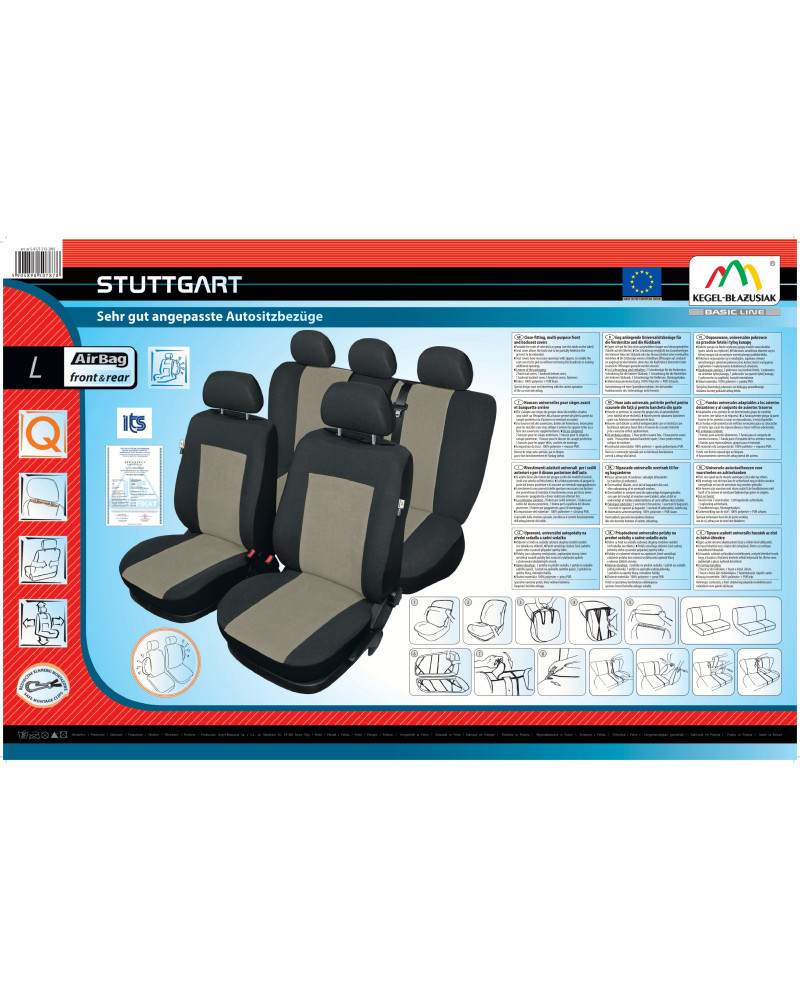 Pokrowce STUTTGART są bardzo łatwe w montażu- szybko się je zakłada, dzięki zapinanym na rzepę otworom, pozwalającym na założenie ich bez konieczności wyciągania zagłówków, a następnie mocuje za pomocą wszytych gumowych uchwytów oraz bezpiecznych, plastikowych klamerek montażowych. Tylna powierzchnia pokrowców jest zabudowana, dzięki czemu chroniony jest także tył siedzeń (ważna cecha dla posiadaczy małych dzieci). Pokrowce łatwo utrzymać w czystości, gdyż można je wyprać zgodnie z informacją na metce- wtemperaturze 40°. Produkt serii BASIC LINE, której hasłem przewodnim jest – bardzo dobra jakość w przystępnej cenie. Produkowany z dobrej jakości surowców . Pokrowce tej marki spełniają wszelkie normy wytrzymałościowe i jakościowe. Ich staranne wykonanie z dobrych materiałów, doskonale sprawdza się w branży samochodowej.