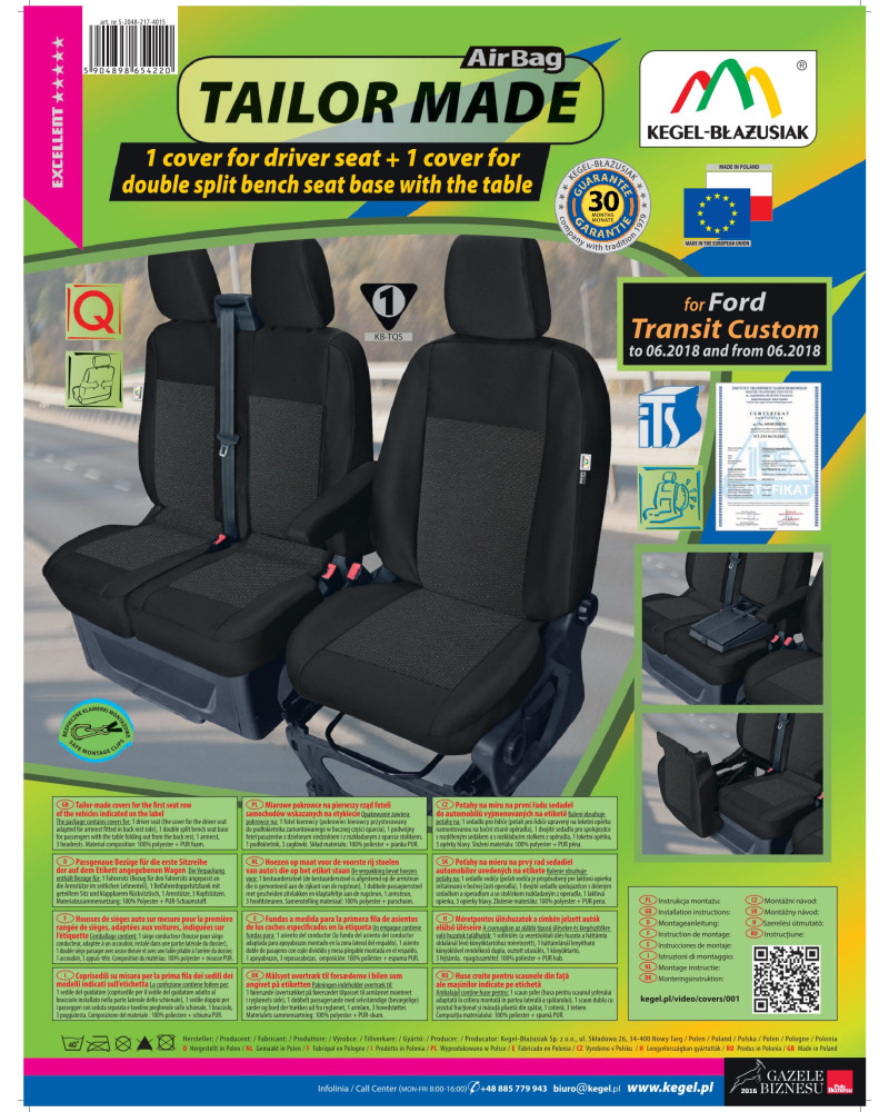 Pokrowce posiadają specjalne, bezpieczne szwy dla poduszek AirBag, dzięki czemu przystosowane są do samochodów zarówno z bocznymi poduszkami powietrznymi w fotelach, jak i do standardowych siedzeń. Profesjonalne wykonanie oraz bezpieczeństwo użytkowania gwarantują certyfikat oraz badania przeprowadzone przez Instytut Transportu Samochodowego.