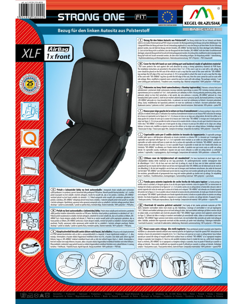 Instrukcja montażu pokrowca zaprezentowana jest na rysunkach od 1 do 5. Jeżeli pokrowiec jest zakładany na fotel z boczną poduszką powietrzną airbag, należy pokrowiec założyć na lewy fotel samochodu, w taki sposób, aby szew pokrowca z wszywką „SRS-AIRBAG” pokrywał się z lewą krawędzią fotela (patrz rysunek 2). Jeżeli nie jest możliwe założenie pokrowca w powyższy sposób, aby krawędź pokrowca z wszywką „SRS-AIRBAG” pokrywała się z lewą krawędzią fotela , to pokrowiec nie może być użytkowany na fotelach z bocznymi poduszkami airbag. Zużyty, modyfikowany lub naprawiany pokrowiec nie może być użytkowany na fotelach z bocznymi poduszkami airbag.